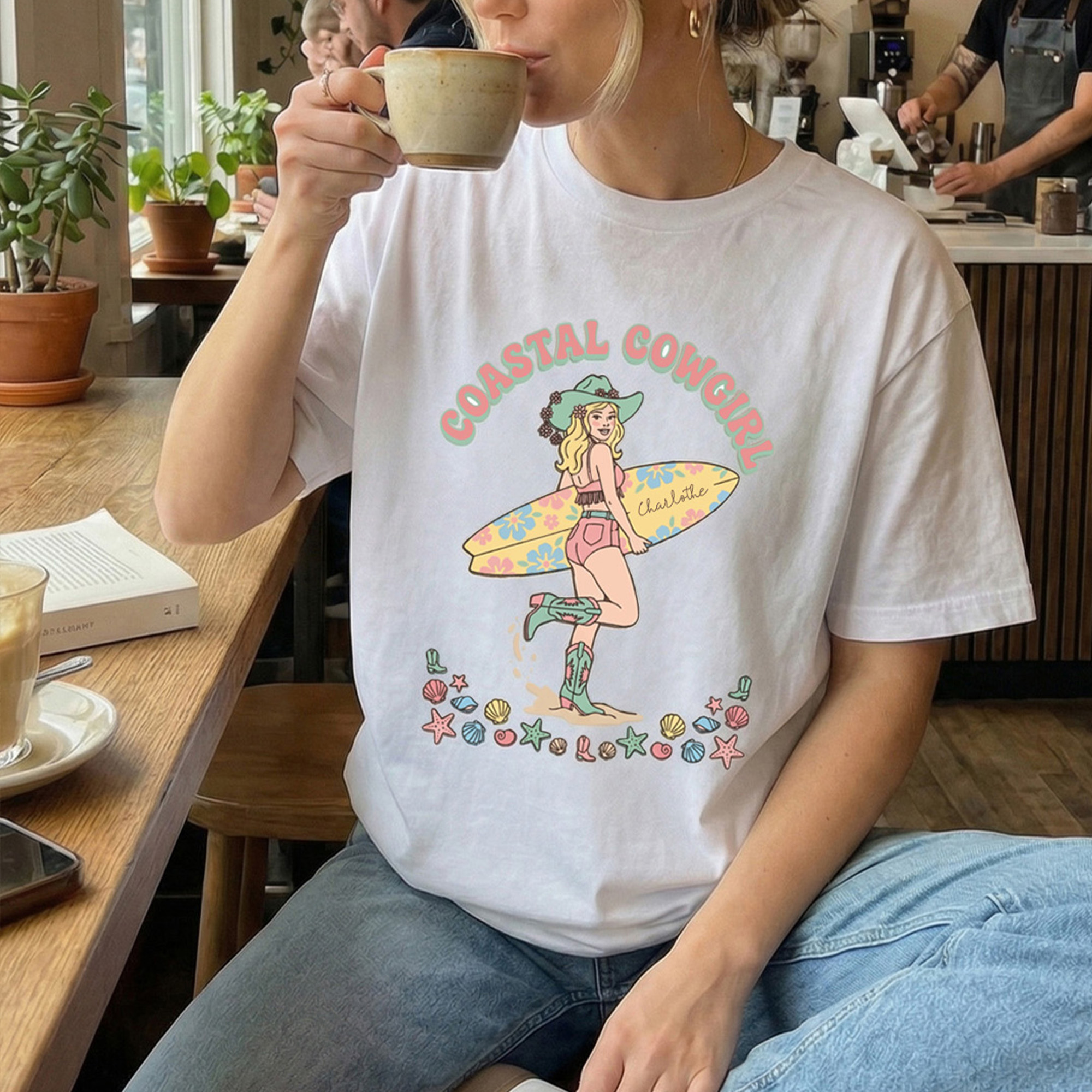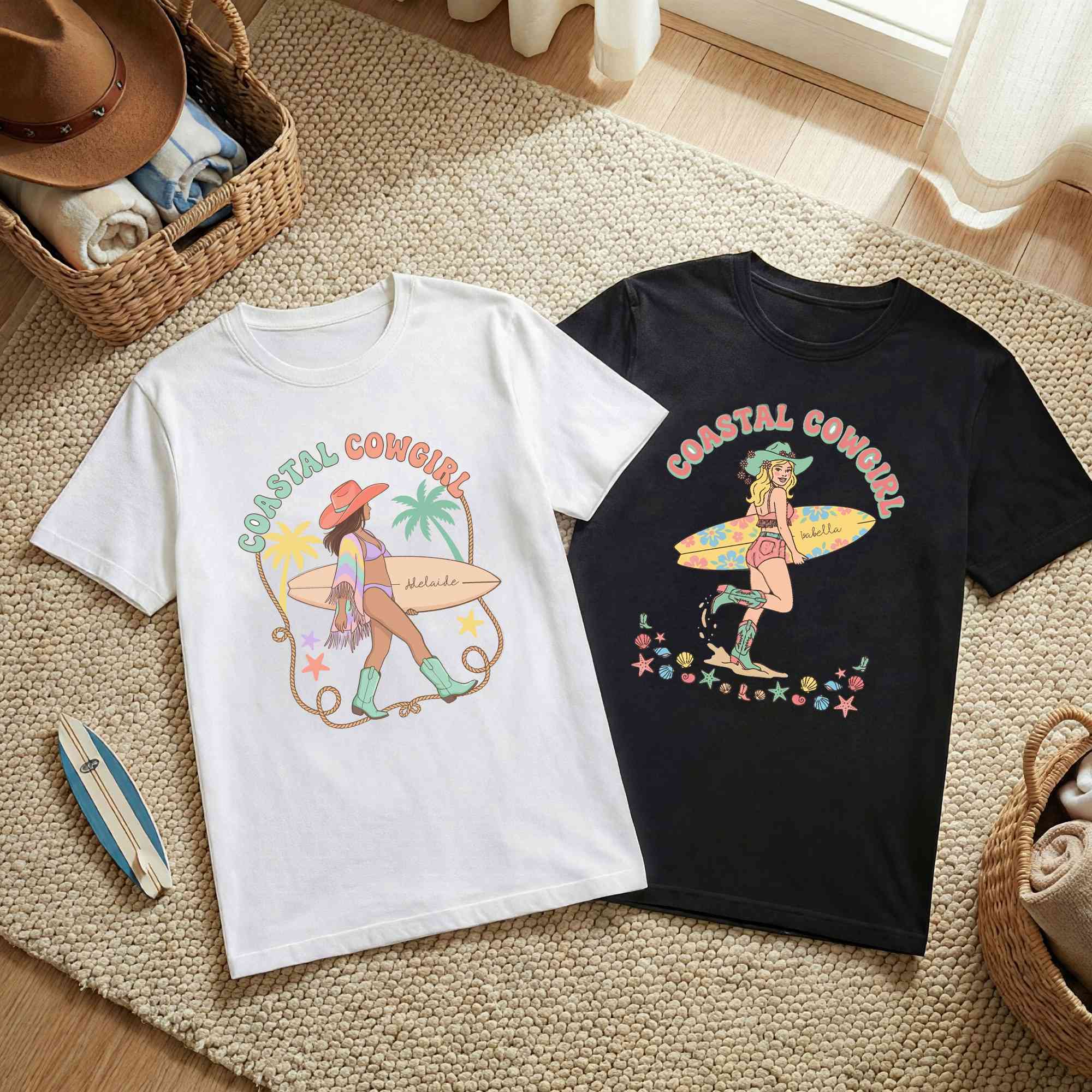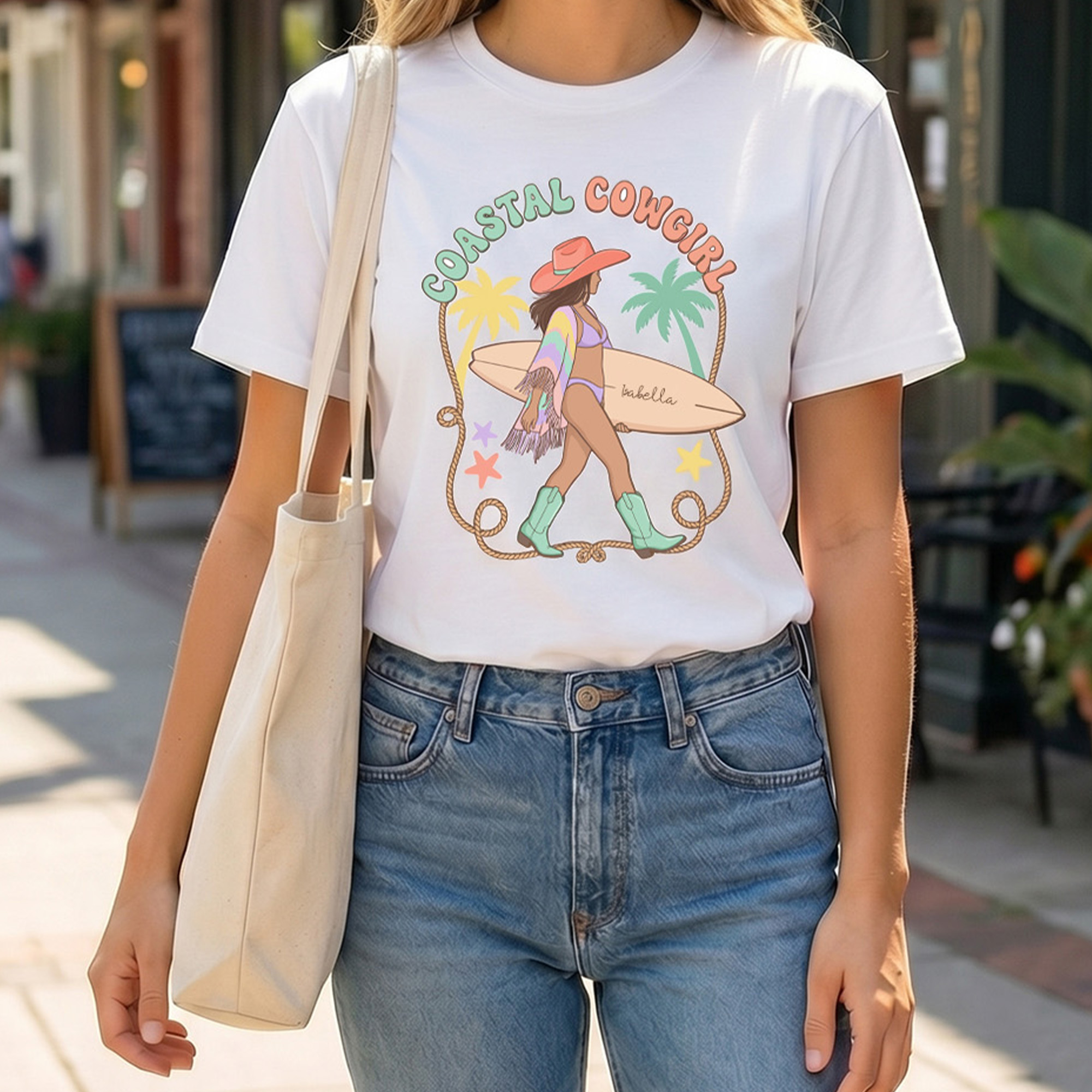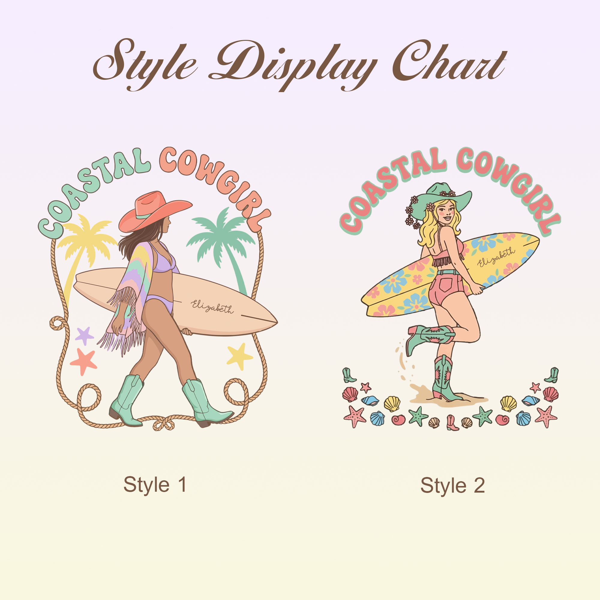 Unique Design - This eye-catching summer T-shirt combines vintage Western influences with relaxed coastal style, highlighted by a bold Coastal Cowgirl silhouette in soft macaron-inspired tones. Fun seaside details such as seashells, starfish, and palm trees are paired with a nautical rope frame, adding a laid-back boho feel. With full personalization available, a name can be added to the surfboard graphic, turning each shirt into a distinctive piece that reflects individual personality.