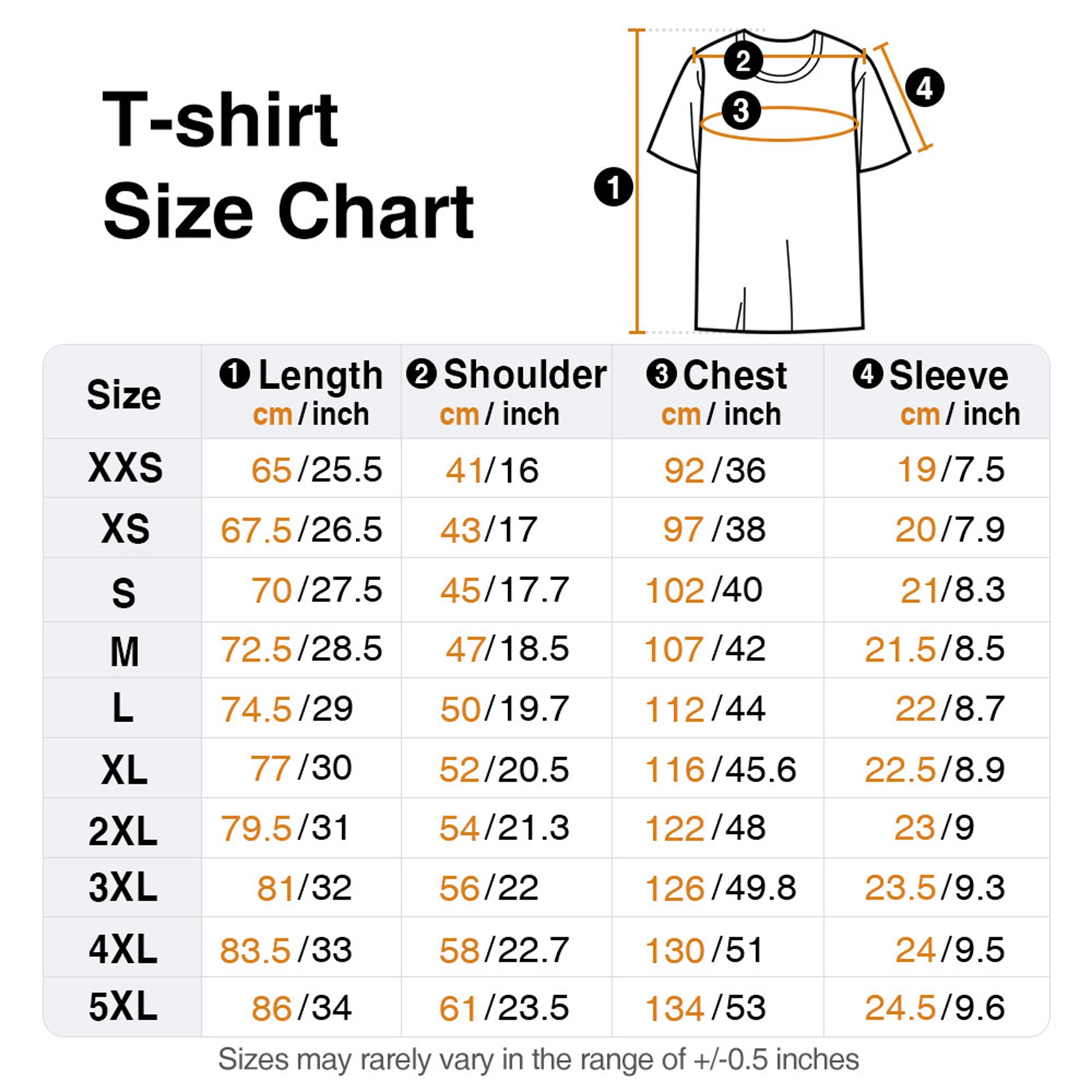 XXS, XS, S, M, L, XL, 2XL, 3XL, 4XL, 5XL